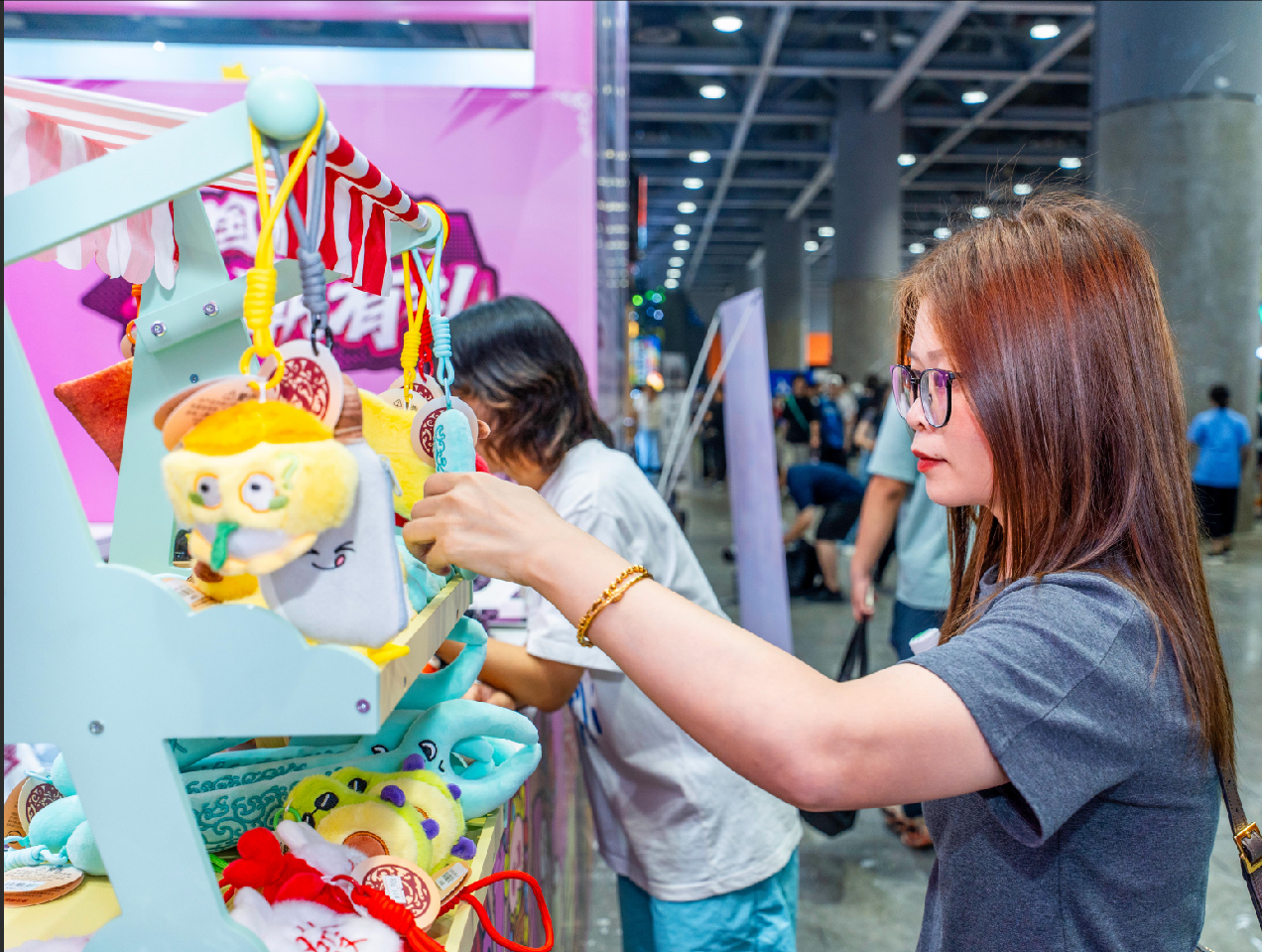 这次,我们带来“南越饮食”IP精心打造的Q萌“烧烤家族”空降现场!灵感源自两千年前南越文王墓出土的精美烹饪器具。那些用于蒸、烤、煎、煲汤的文物,如今化身成萌趣的毛绒挂件,以及承载着“广东人餐桌灵魂美味”的烧鹅毛绒挂件、“运财金猪”玩偶......这些萌物不仅复刻了“王的BBQ”,更传递出广东人爱吃、会吃的文化基因,让承载着烟火气的文物,“活”在当下年轻人的心中,成为现场年轻人争相追捧的焦点。